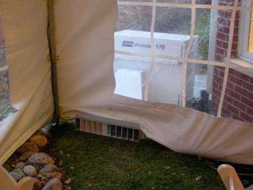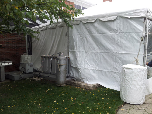 Should the temperature begin to drop, a heated tent offers a cozy environment for your guests. Propane heater units maintain a comfortable temperature throughout a tent. They are placed outside the tent and controlled by an inside mounted thermostat. Hot air is forced into the tent through diffuser vents placed on the ground. All heated tents require sidewalls so the warm air does not escape. Electric heat is also an option for those municipalities that do not allow propane heating. Heaters are extremely easy to operate. The thermostat allows for worry free operation.