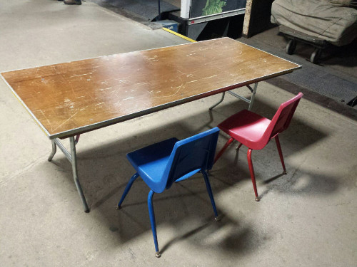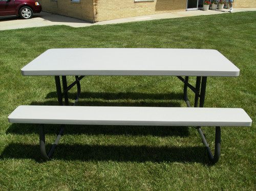Picnic Tables are 6-foot long plastic tables with attached benches that fold flat to transport.
