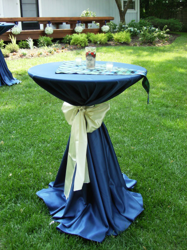 Umbrella Tables are 48-inch round and are used in an outdoor settings to add a festive look with sun protection while enjoying a beautiful day.