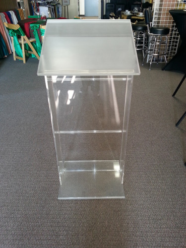Carpeted Stage with skirting microphone with speakers and wooden podium