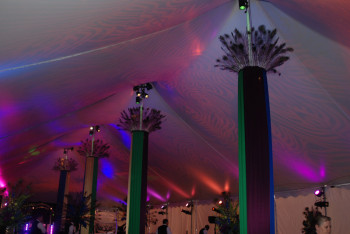 Up-lighting cans are placed on poles around the perimeter of the tent or affixed to tent poles. This provides a dramatic effect for any occasion by bouncing reflective light off the tent ceiling.