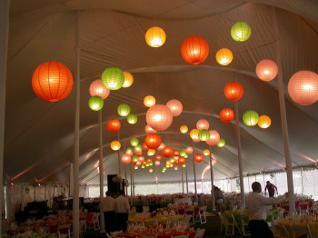 Paper Lanterns are light weight light fixtures that can be easily suspended from the ceiling of a tent. Large paper lanterns work well to fill up a large tent space. White paper lanterns provide a crisp wedding like atmosphere. Brightly colored paper lanterns offer a fun festive look.