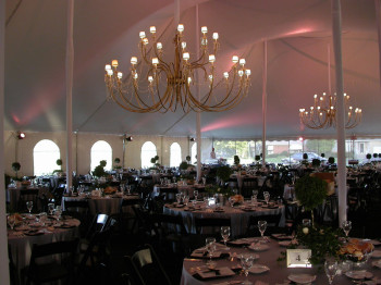 Chandeliers are available in several colors and a variety of sizes to complement any tent size. Styles range from elegant with crystal beads, prisms and lamp shades to a very simple stated sophistication.